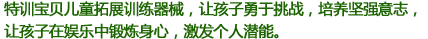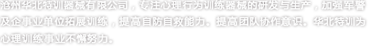 滄州華北特訓器械有限公司成立于2002年,是專業(yè)研發(fā)生產(chǎn)心理行為訓練器械、拓展器械、拓展器材、攀巖、兒童拓展器械的專業(yè)型企業(yè),并通過ISO-9001質量管理體系認證及ISO-14001環(huán)境管理體系認證,致力于各職業(yè)群體提供的心理行為訓練器械、拓展器械、攀巖、兒童拓展器械等設備,使之不斷提升心理健康水平、充分開發(fā)自我潛能。我公司竭誠為廣大客戶提供專業(yè)化各類心理行為訓練器械相關產(chǎn)品和服務。